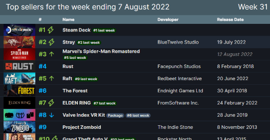 Steam公布了上周游戏数据了,今天我们盘点一下Steam游戏销量排行榜有哪些作品连续登陆榜单的,截止时间2022年8月11日 Steam Deck掌机获得连续十周榜首冠军,还特别注明公布三款连续登陆榜单和评分特别高作品