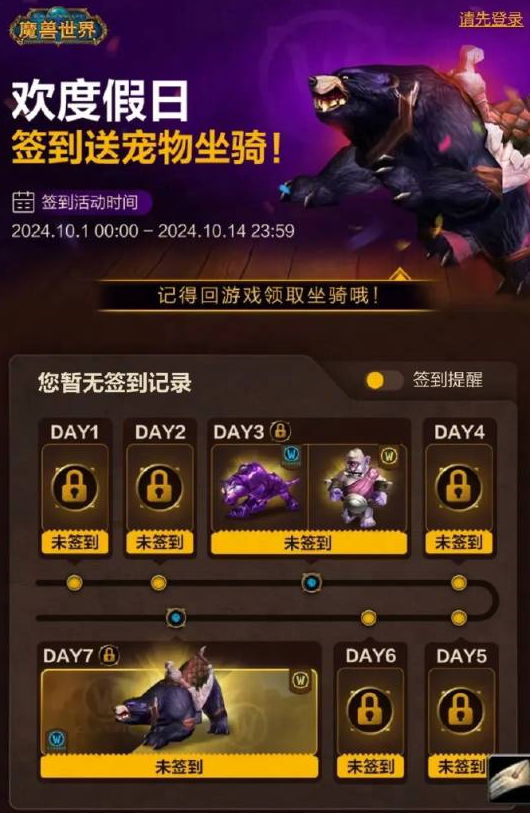 2024年10月1号至2024年10月14号期间参与签到活动,有机会获得奖励,这个新活动非常值得关注 《魔兽世界》新老玩家准备好了吗,关注这次国庆新活动内容吧