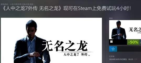 知名游戏《如龙7外传:无名之龙》Steam免费试玩活动开启上线了,喜欢这款游戏赶快参与试玩活动四小时