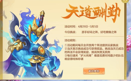 2025年4月28号至2025年5月5号上线五一活动天道酬勤,每日10:00-23:00期间可以参与二次天道酬勤挑战 ”