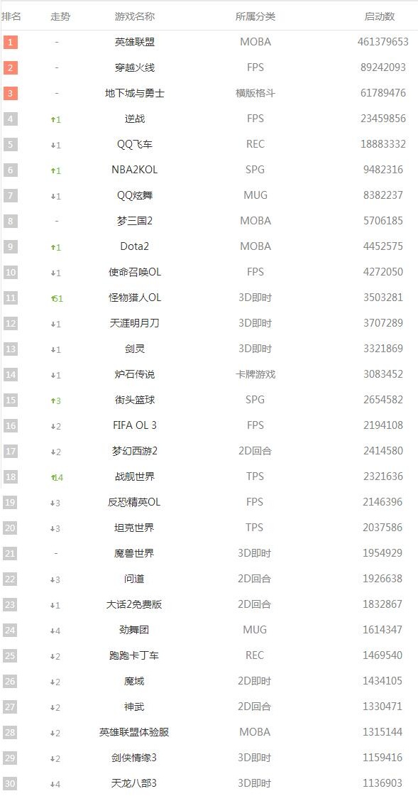 2016年3月份上线网吧网游人气排行榜前三十名图