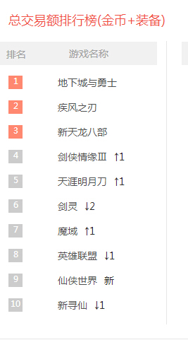 根据本周游戏币交易数据总数,游戏出现和新上榜网游,包括稳定居位,游戏根据游戏币交易总数和显示数据,根据热门交易数据排名显示