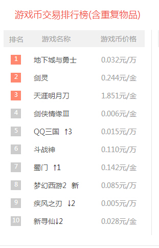 游戏币数据排名如下图片