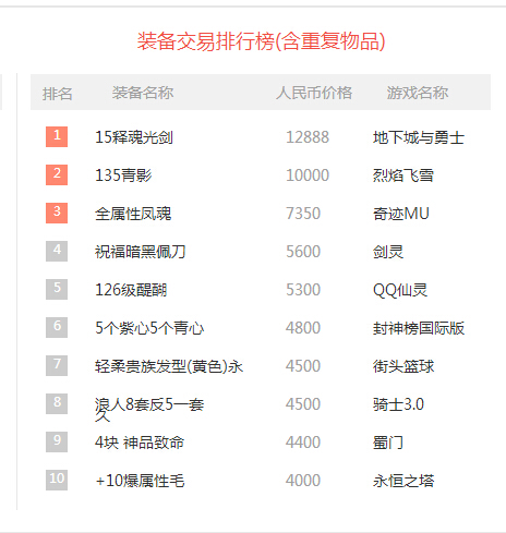 热门网游6月份本周装备交易排行榜