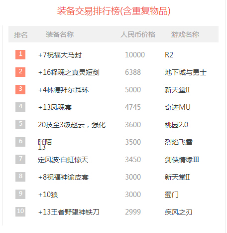 包括这次10月17日-10月23日装备交易排行榜,游戏也包括物品重复等,包括目前上线的新装备《地下城与勇士》+7祝福大马封人民币10000元,也争夺这次网游装备单件幅度比较高的装备武器